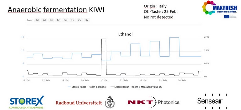 The MAX FRESH system is able to detect relevant volatiles which are produced by the process of ripening such as ethylene. By measuring each storage room on a daily basis, the system provides an accurate overview / trend of the maturation / senescence of the fruit. The decision-making-model based on the Max Fresh measurements, provides the storage operator an excellent tool to (re)act in time to prevent significant loss of quality .